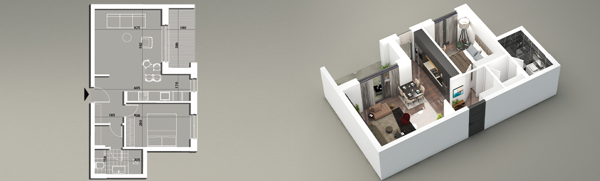 Qëndrimi Ditorë dhe Kuzhina: 25.3 m2 | Dhoma e Fjetjes: 10.6 m2 | Banjo: 4.7 m2 | Koridori: 6.3 m2 | Ballkoni: | 3.5 m2