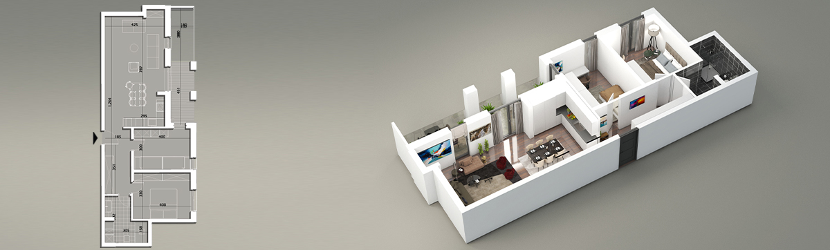 Qëndrimi Ditorë dhe Kuzhina: 27.4 m2 | Dhoma e Fjetjes: 11.9 m2 | Banjo: 5.4 m2 | Depo: 1.1 m2 | Koridori: 6 m2 | Ballkoni: | 9.3 m2