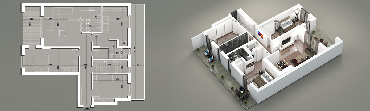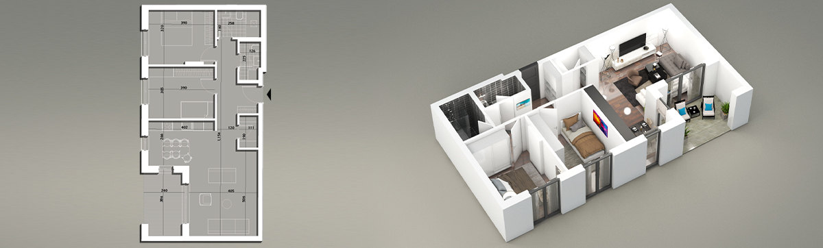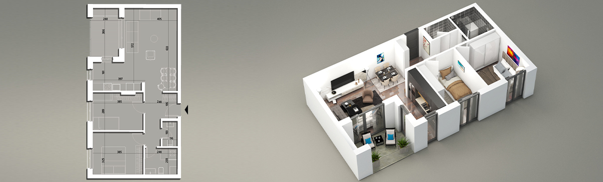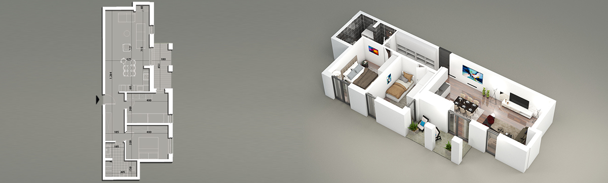 Qëndrimi Ditorë dhe Kuzhina: 29.6 m2 | Dhoma e Fjetjes: 15.7 m2 | Dhoma e Fjetjes: 13.6 m2 | Banjo: 4.4 m2 | WC: 2.4 m2 | Depo: 2.3 m2 | Koridori: 8.5 m2 | Ballkoni: | 8.8 m2