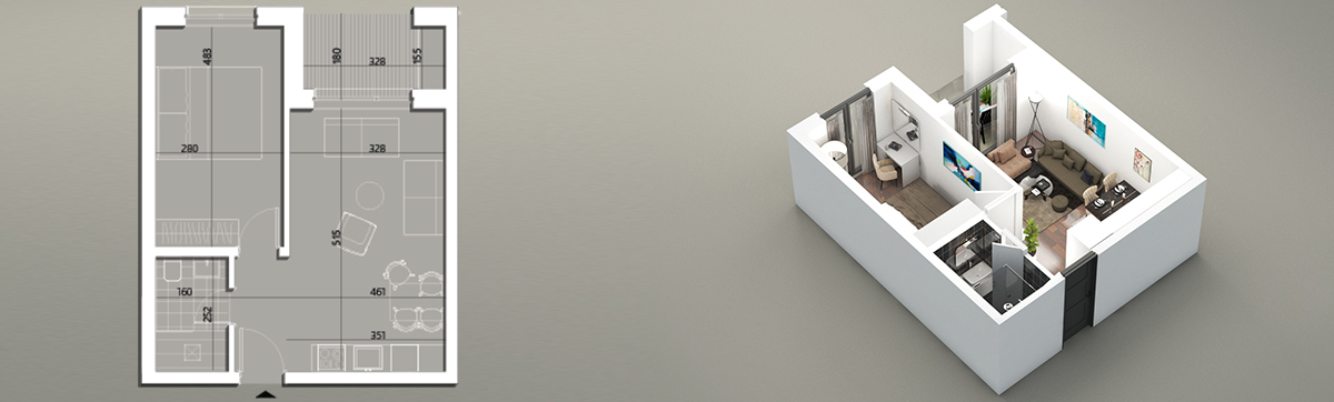 Qëndrimi Ditorë dhe Kuzhina: 23.3 m2 | Dhoma e Fjetjes: 10 m2 | Banjo: 7.1 m2 | Koridori: 5.9 m2 | Ballkoni: | 9.2 m2