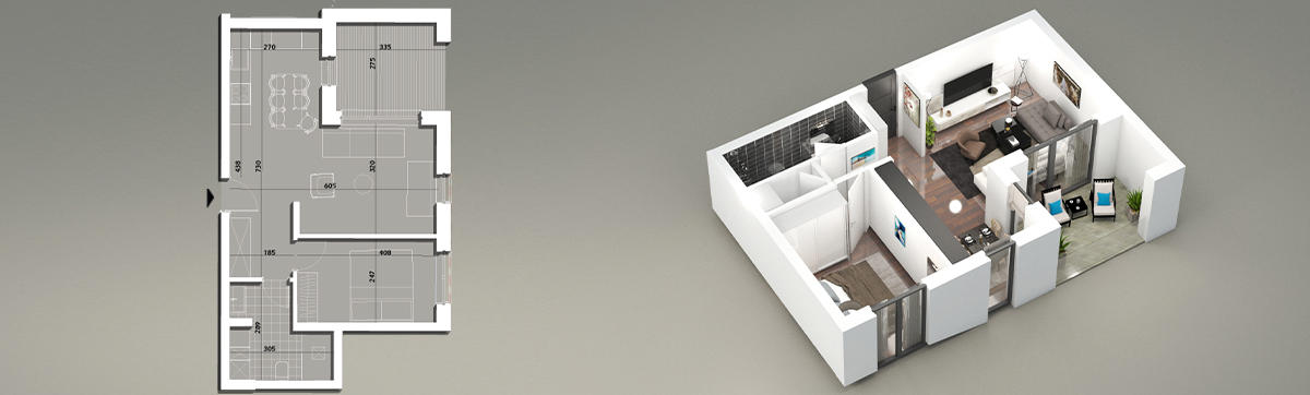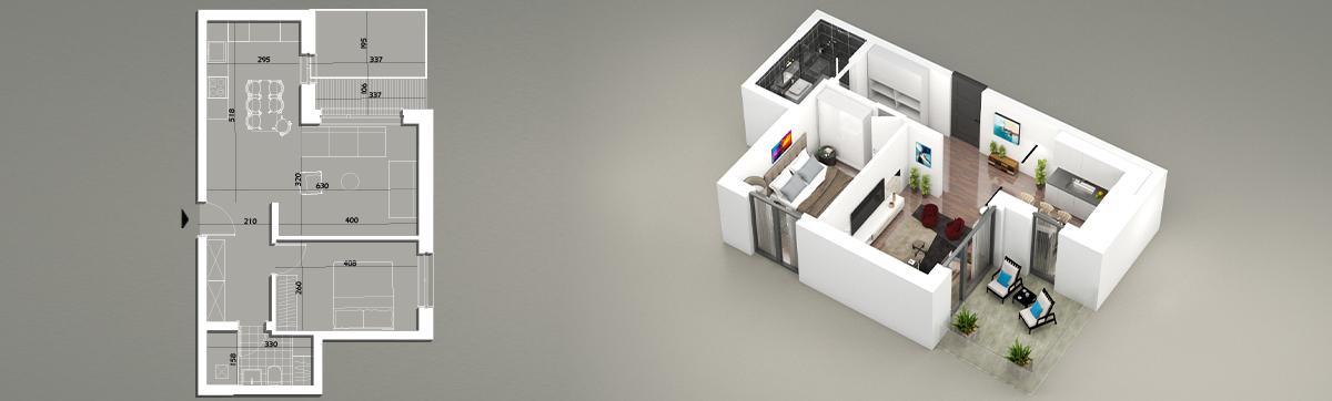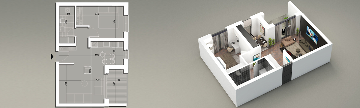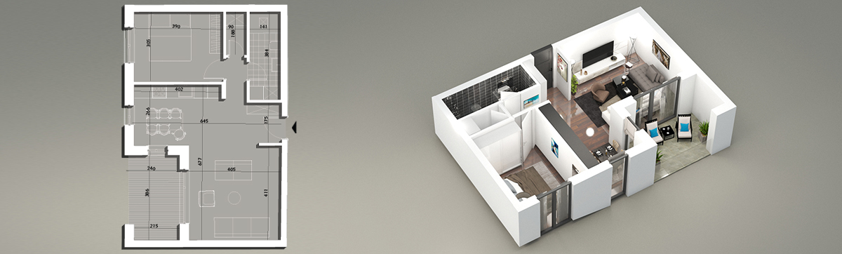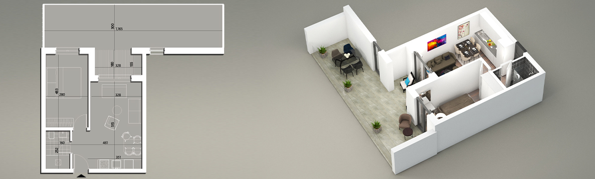 Qëndrimi Ditorë dhe Kuzhina: 19.6 m2 | Dhoma e Fjetjes: 13.5 m2 | Banjo: 4 m2 | Koridori: 3 m2 | Ballkoni: | 5.9 m2